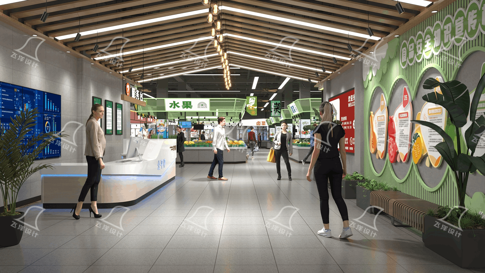 面對(duì)設(shè)施老化、顧客流失的困境,飛洋設(shè)計(jì)為紹興禹南農(nóng)貿(mào)市場(chǎng)制定了“省三星級(jí)市場(chǎng)+省放心市場(chǎng)+五化市場(chǎng)”標(biāo)準(zhǔn)??臻g上采用回字形動(dòng)線避免擁堵,并按品類科學(xué)分區(qū),增設(shè)自產(chǎn)自銷專區(qū)吸引本地農(nóng)戶。智慧化改造是核心亮點(diǎn):市場(chǎng)全覆蓋電子支付系統(tǒng),配備智能溯源電子秤、農(nóng)殘檢測(cè)室,數(shù)據(jù)實(shí)時(shí)對(duì)接監(jiān)管平臺(tái)。商戶信息屏公開營(yíng)業(yè)執(zhí)照、抽檢結(jié)果及投訴渠道,消費(fèi)者可通過掃碼獲取全流程溯源信息。這一設(shè)計(jì)既保留了傳統(tǒng)市集的親和力,又通過大數(shù)據(jù)分析幫助商戶優(yōu)化進(jìn)貨策略,實(shí)現(xiàn)了“智慧”與“煙火氣”的共生。