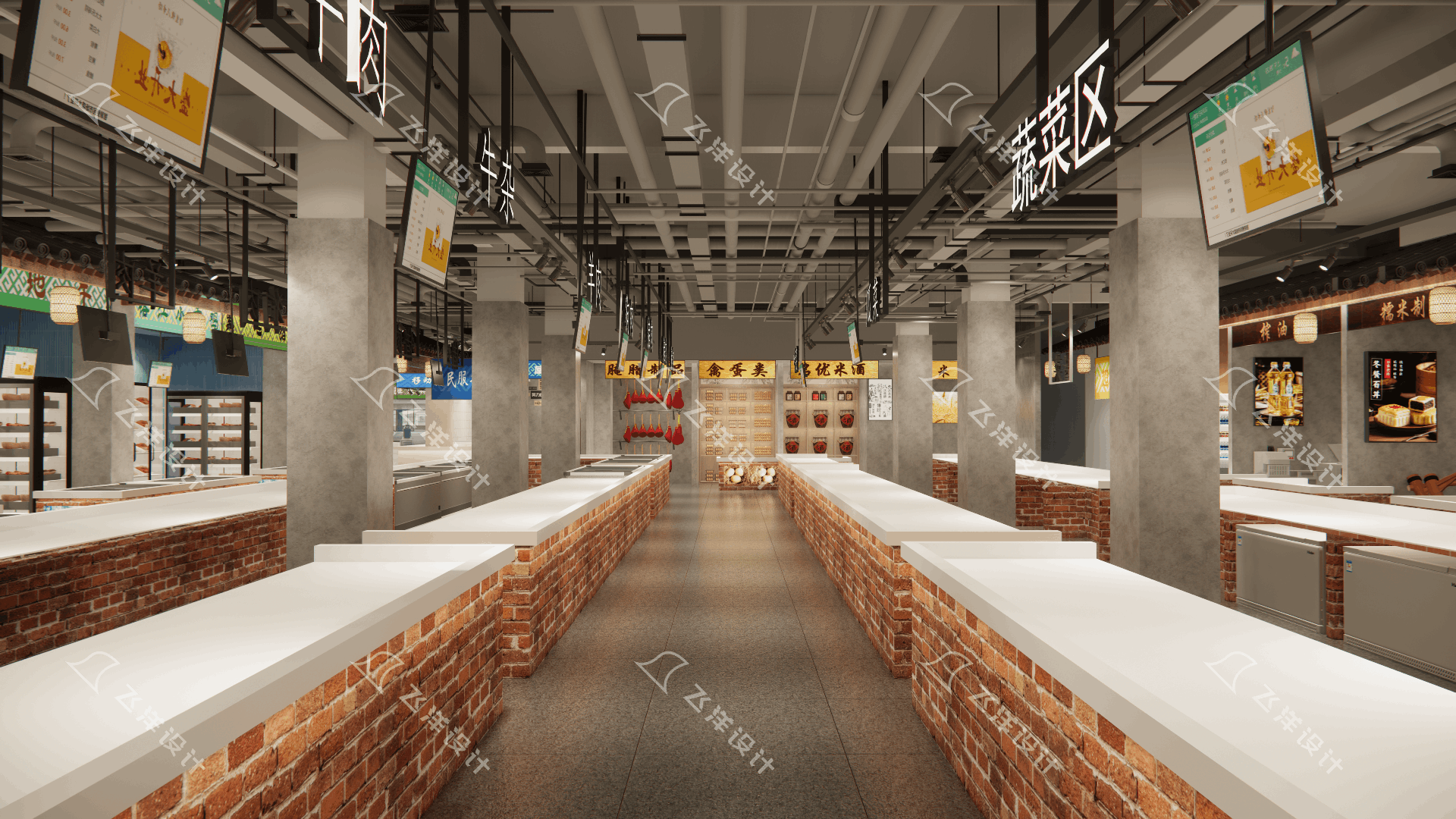 黔山市集原址為貴州凱里三商場半地下室空間,前門位于負(fù)一層,后門連通地面一層,是連接城市不同標(biāo)高的特殊商業(yè)體。本次改造以亮點吸引直達(dá)動線、規(guī)避半地下室交通閉塞為主要矛盾解決思路,以"胖東來"服務(wù)理念與品質(zhì)標(biāo)準(zhǔn)為藍(lán)本,深度融合黔東南苗族侗族文化元素,通過品牌化、精品化、體驗化的全面升級,打造集在地農(nóng)產(chǎn)品展銷、民族手作體驗、特色美食加工于一體的區(qū)域性農(nóng)貿(mào)標(biāo)桿,讓傳統(tǒng)市集成為展示貴州風(fēng)物的重要平臺。